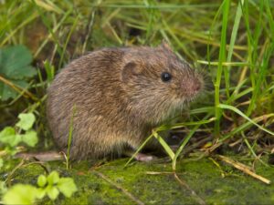 Voles, sometimes referred to as meadow mice, are small rodents that resemble mice but have stouter bodies, shorter tails, and a rounder face with smaller ears. Their eyes are not as prominent as those of a mouse and their fur can range from reddish brown to a grayish color.